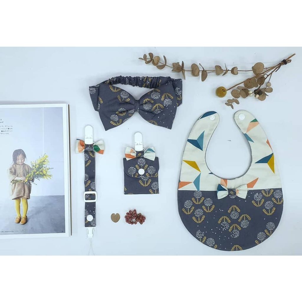 布料(二重紗)主布料:40cm×110cm;副布料:20cm×55cm、單膠鋪棉20*15cm、鬆緊帶2cm×15cm1條、版型2張A3、奶嘴夾×2個、日形環×1個、四合扣4組(不含照片裡的吊飾繩)
